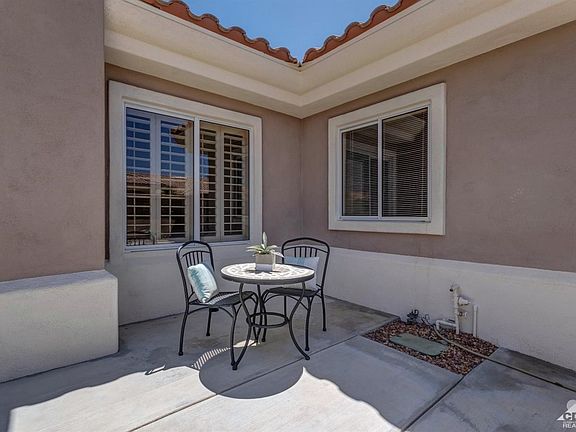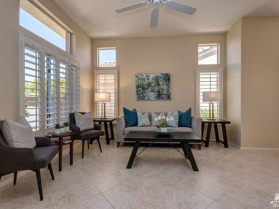 55+ Sun City Palm Desert. Pristine and elegant Lalique model located close to the main Mountain View clubhouse. South facing patios off living area and master bedroom. Nice curb appeal as you enter through gated courtyard with extended sitting areas for enjoying your morning coffee. Inside, 10 ft. ceilings and transom windows provide a light and bright open concept floor plan, plantation shutters, All fresh new interior paint and carpet in desert tones. Tile flooring used extensively, carpet in bedrooms only. Large dining room and living room opens up to family room and kitchen. Kitchen has newer appliances, corian counters and kitchen nook area with view of the patio. Master bedroom has sliding door leading to its own private covered patio. Master bath has dual vanity, skylight, walk-in closet. Generous guest bedroom, bath has tub and skylight. Large service area near garage can be used for office. 5 Ceiling fans. Backyard is private w low maintenance landscaping.