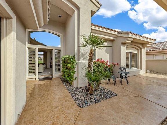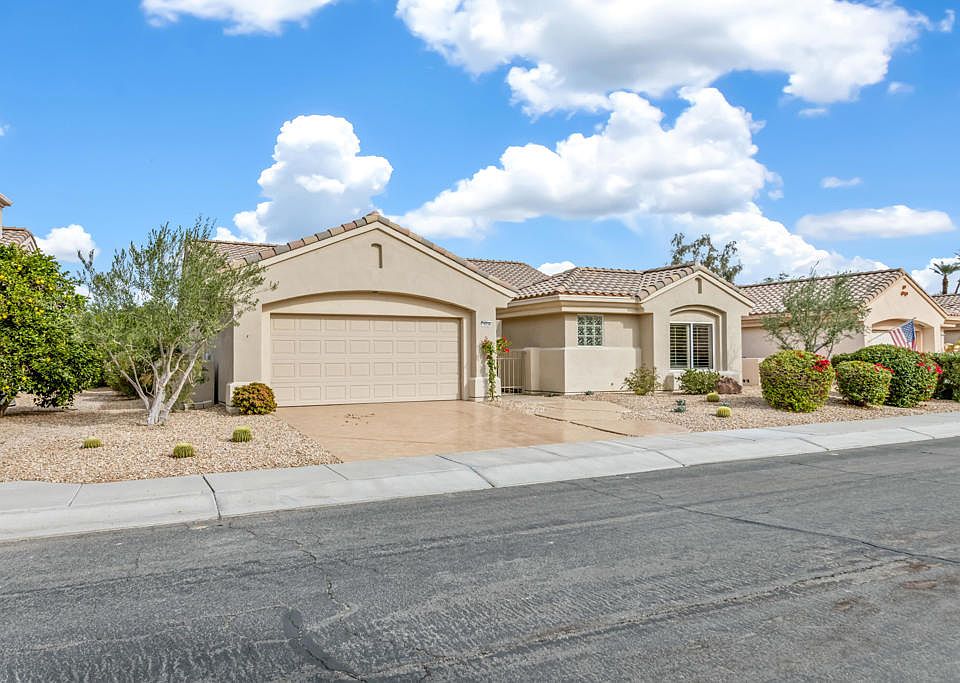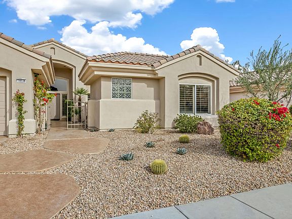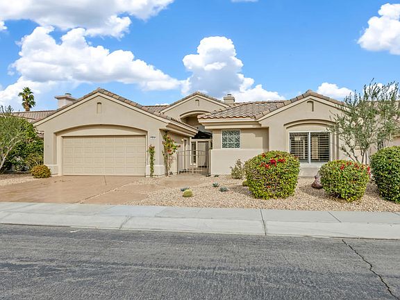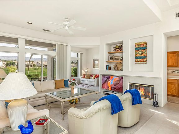 Welcome to Sun City Palm Desert. This Fostoria model (is similar to the Morocco) with a detached private Casita. It sits high above the golf course and the second Tee box with spectacular views of the golf course and the mountains. The main home is a two bedroom two bath with an office and the casita is a one bedroom plus a 3/4 bath. The back yard is North East facing. The home has a large transom window over the front door. There are high ceilings and a very open floor plan with a fireplace in the living room. The kitchen has updated appliances and skylights to invite the sun light in.The master bedroom is in the rear of the home with beautiful views! Sun City Palm Desert is a 55 plus community featuring two 18 hole gold courses, three club houses, pools, tennis and pickle ball courts, with loads of fun loving social clubs. You will never have a spare moment if you so desire. Come join the many wonderful families at Sun City.