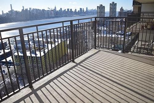 Spacious 2 bedroom 2 bath Waterfront Condo in The Parker Imperial. This condo was originally a 1 bedroom 1.5 bath converted to a 2 bedroom 2 bath + home office. Condo is 1200sq.ft. Condo boasts Panoramic NYC & Hudson River Views from all rooms & large covered balcony, hardwood floors throughout, a beautifully upgraded kitchen w granite counters & all stainless steel appliances including a wine cooler. The Large Master bedroom has a Master bath, an enormous Walk-in Closet and a home office. The second spa like bathroom has all onyx tiles & a stand up shower spa. The living room & dining area span 27 feet. Apt. has 2 large walk-in closets. The Views from this apt. are Amazing. The Parker Imperial features 24hr doorman, 24hr garage attendant, a laundry room on every floor, an outdoor heated pool with huge sun deck, an on-site fitness center, free tennis in adjacent 167 acre Hudson County Park. Park has a lake & many sporting activities. Trans to NYC at door.