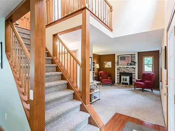Character and charm throughout this very well cared for home nestled on a picture-perfect lot. Perfect for entertaining. Enter from the covered front porch to find a nice open floor plan with gorgeous views from every room. The charming kitchen features large island, Corian counters, stone backsplash, and hardwd fls. Spacious family rm includes a coal stove and amazing views of the spacious and very private back yard which includes many mature manicured trees. All of the bedrooms are generous in size. Updated bath, plenty of closet space. Laundry hook up on 2nd floor. Finished walk out lower level adds tons of additional space with another bedroom and half bath. Spacious deck and patio offer the perfect outdoor living spaces. The outbuildings offer endless possibilities with tons of storage and includes an all new modern home office. This is a very special and extremely peaceful property with so much to offer. Gorgeous grounds all 4 seasons.