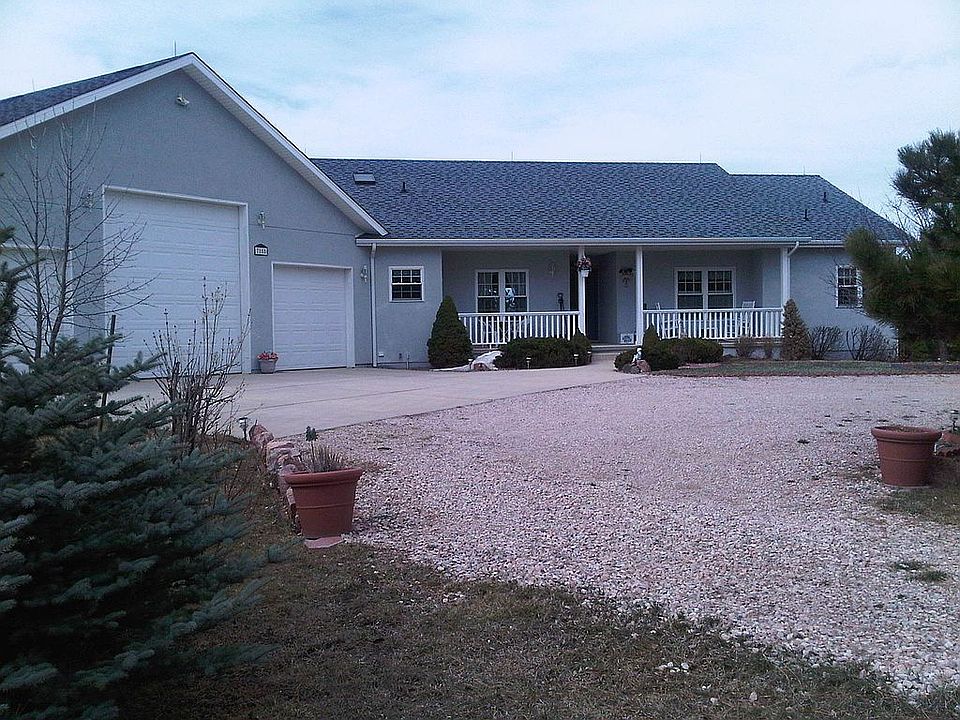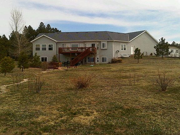 Beautiful custom built, family-oriented home on almost 6 acres in Black Forest. DISTRICT 20 SCHOOLS. One level living on upper level with huge master bed room/bath combination, office/den (that could be used as a bedroom), additional separate bedroom and bath, kitchen, dinette, and formal dining room. Send the kids downstairs to enjoy three oversized bedrooms, bath, and huge family room. Lower level includes a walkout to a large patio and backyard area complete with a koi pond with stream and waterfall. This home features SPECTACULAR VIEWS of Pikes Peak and the Front Range from the Living Room, Kitchen, Kitchenette, Mater Bedroom, and Solid Redwood Deck. The northeast 1/3+ of the lot is well-maintained forest land, while the southwest offers breath-taking views. This home also includes an over-sized 3 car garage (We keep 4 cars and a lawn tractor in it!) The center bay is designed to accommodate a motor home. The home also features custom oak woodwork, including solid core oak room doors, oak trim, oak cabinets and oak fireplace/mantle, plus a builder-installed lightning protection system. Dual furnaces and water heaters allow independent functioning on upper and lower levels.