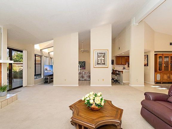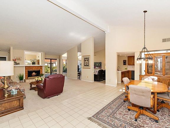 Attractive price improvement on this vibrant condo nestled near the majestic mountains in Indian Wells. Expansive views surround the enchanting community of Casa Rosada. You are immediately put at ease by the entry atrium and then walk into the expansive great room floorplan with vaulted ceilings and gas fireplace add to the wow factor. An adjacent sunken den area invites quiet time or entertaining at the bar. Step outside on a private patio and enjoy lavish roses, a beautiful greenbelt and nearby pool/spa. The eco-friendly kitchen has electric appliances, wood cabinets, and an adjoining laundry room with newer Maytag units. This three-bedroom condo includes a prominent owner's suite with ample storage, three closets, and an ensuite with a soaking tub and separate tile walk-in shower. Guests enjoy privacy in a second bedroom with ensuite, including a shower over a tub. The third bedroom allows for dual functionality as an office or bedroom. The oversized two-car garage includes several custom built-in cabinets. Updates include a new tile roof and skylights, an AC unit (installed in 2023), and a newer water heater. This condo is move-in ready or for remodeling to your taste. Located near a community pool and spa. Casa Rosada is a gated community across from the lush fairways of the Indian Wells Country Club and situated near many local services, restaurants and outdoor activities.