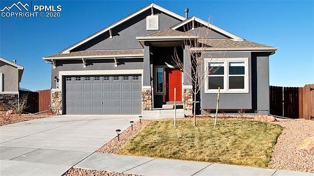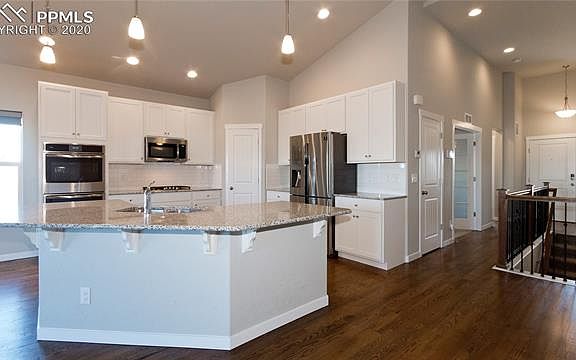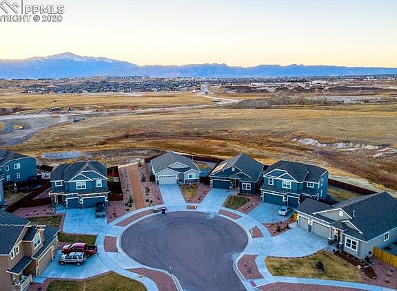 ~ If you are looking for a ranch home that backs to open space and an unobstructed view of Pikes Peak this is it! This beautiful one-year-old stucco and stone home sits in a quiet cul de sac backing to a neighborhood walking trail and a huge view. Hardwood floors throughout the main level, tall vaulted ceilings in the living room, gourmet kitchen with modern white cabinets, a gas cooktop, double ovens, counter depth refrigerator, large pantry, granite countertops and an oversized island. Main level office with french doors, master bedroom with a five-piece master bath. Custom built-in closet in the master and front bedroom. The garden level basement has nine-foot ceilings, a wet bar in the comfortable rec room, a separate theater room that is pre-wired for surround sound and a projector. Two large bedrooms and a full bathroom. Enjoy the fully landscaped and fenced backyard and those Colorado sunsets from the extended deck or go to the spacious concrete patio on the lower level with a hot tub pre-wire for that spa you have always wanted ~