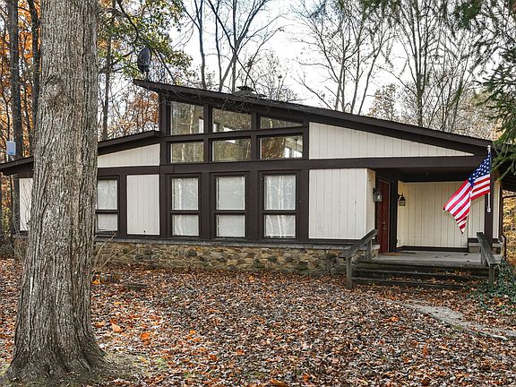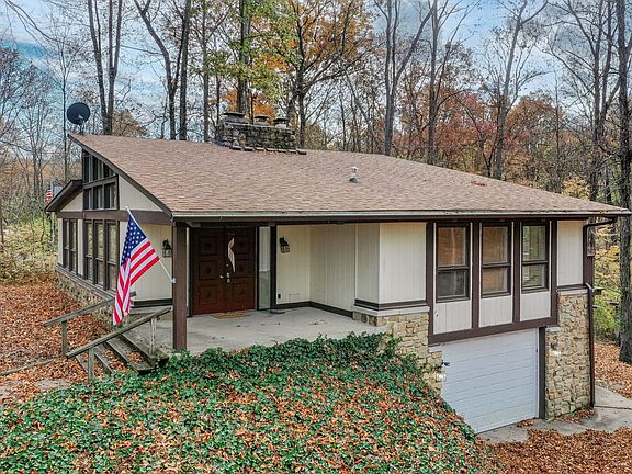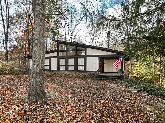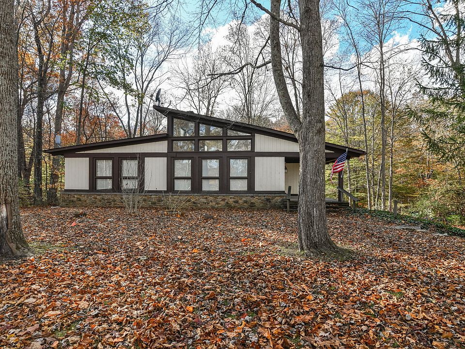 This very cool Frank Lloyd Wright - inspired home is nestled upon 2.5 wooded acres with beautiful mature trees, a winding creek bed and is full of wildlife. While sitting on the large upper deck, expect to see deer frolicking on the hillside. This home is a reverse floor plan with the main bedrooms located in the lower level with private patio access. The main floor of the home has new carpeting throughout and is ready for all of your entertaining needs with two large living spaces full of windows connected by a massive two-sided gas fireplace. Don't miss the fun rustic shed out back waiting for it's next adventure...a great playhouse or super fun party barn! This secluded location is just minutes from Nashville and within close proximity to Bloomington. Enjoy on the weekends or year round! This is a special property you won't want to miss! HVAC 2017, 40yr roof 2017