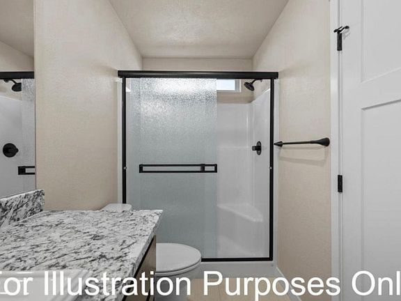 The bathroom showcases a beautifully tiled floor, a spacious walk-in shower with glass doors, and a vanity that mirrors the kitchen's sophisticated finishes. Matte black fixtures and lighting add a refined, modern touch.