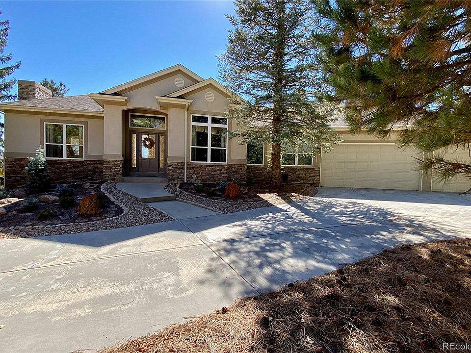 Stunning picture-perfect views of Pikes Peak. Custom ranch home on just over 3/4 of an acre. The deep flag lot has a long suspenseful driveway that brings you to the home. You can see peek-a-boo views of Pike Peak as you approach the home. It's so private you feel like you're in your own forest. This is an ideal floor plan for main floor living. It's complete with a main floor office, formal dining, family room, master bedroom, kitchen, and laundry room. The laundry room is conveniently located with easy access to the master closet so you don't have to carry heavy loads of laundry across the house. The fully finished walkout basement is great for guests and entertaining. Aside from the large rec room and TV room with a wet bar, there are two additional bedrooms and 3 bathrooms. Take your choice of either of the two amazing outdoor spaces. The large deck upstairs is ideal for soaking in the mountain and sunset views or kicking back on the lower patio where you have equally as expansive views. The lower patio would be the ideal spot for a new fire pit and hot tub. Professional photos coming this week. Some of the grass in the backyard might extend over into the open space or HOA land. Buyer to verify.