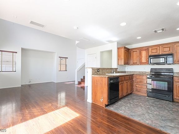 Spacious two-story home featuring an open floor plan with laminate flooring downstairs and neutral carpet upstairs. The inviting living area offers vaulted ceilings, a ceiling fan, and a media niche, seamlessly connecting to the dining area and kitchen. The kitchen is equipped with granite countertops, built-in microwave, and all appliances included. Upstairs, the large primary suite boasts a ceiling fan and a generous walk-in closet, while the additional bedrooms also include ceiling fans for comfort. A conveniently located laundry room includes a top-of-the-line washer and dryer. Enjoy a nicely sized patio, perfect for relaxing or entertaining outdoors.