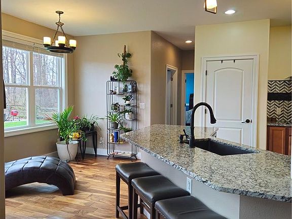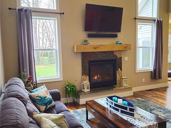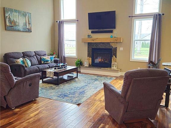 This stunning 2017-built home is filled with high-end upgrades. It features four bedrooms, including a main-floor master with 10' tray ceilings, a tiled bath, walk-in shower, and large closet. The open living area boasts 18' cathedral ceilings, acacia wood floors, and a fireplace with a white oak mantle. The gourmet kitchen has granite counters, and induction stove, a wall oven, and a pantry. Upstairs are three large bedrooms and an unfinished bonus room. The finished basement includes a theater room, a kitchen, and rec room. Outside, enjoy a serene patio and a small garage for extra storage.
