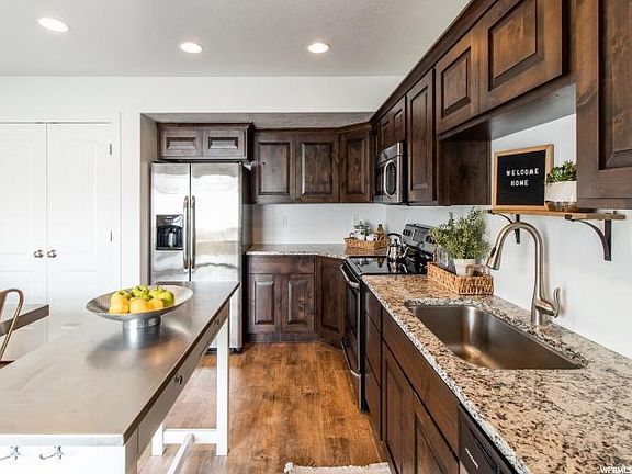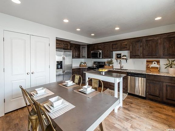 CALL OR TEXT TO SHOW. OPEN HOUSE TOMORROW 1-4:30. Look no further! This immaculate townhome is better than new! Upgraded throughout - granite countertops, solid wood kitchen cabinets, LVP flooring, wood railing with steel ballisters, stainless appliances and more. Spacious kitchen, large master with walk-in closet, big east facing backyard patio with mountain views. The garage is deeper than the typical townhome in this price range to accommodate larger vehicles. Located on a quiet dead-end street in a highly sought after Kaysville neighborhood. Come by this Saturday the 22nd to the open house launch. Open 1-4:30, refreshments will be served. This is a fantastic opportunity that won't last!