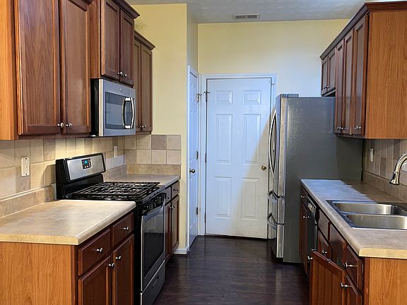 Enjoy this cozy three bedroom, 2.5 bath townhome with open floor plan. This home features a large den that opens to breakfast room and kitchen with solid wood cabinets, stainless appliances, includes, stove, dishwasher, refrigerator and microwave. Three bedrooms on upper level with garden tub in master and shower. Laundry room on upper level. One car garage and patio.