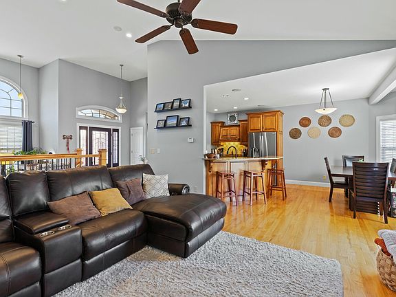 Inside, the spacious open floor plan is highlighted by sky high ceilings, a cozy gas fireplace & sturdy hardwood floors. This gives a touch of luxury to this beautiful retreat. The chef-inspired kitchen features sleek quartz countertops, lovely back splash & a functional convection oven. It's ideal for both cooking and entertaining. The spacious, open floor plan showcases a beautiful primary bedroom featuring an elegant tray ceiling, adding a touch of sophistication. The primary bath is a spa-like haven with a luxurious tile shower, double sinks, and an expansive walk-in closet, offering ultimate comfort and convenience.