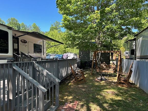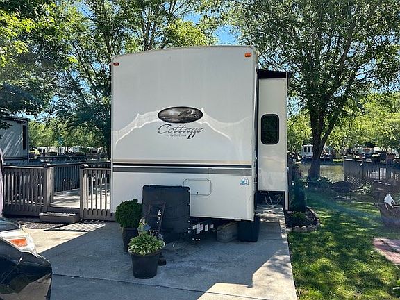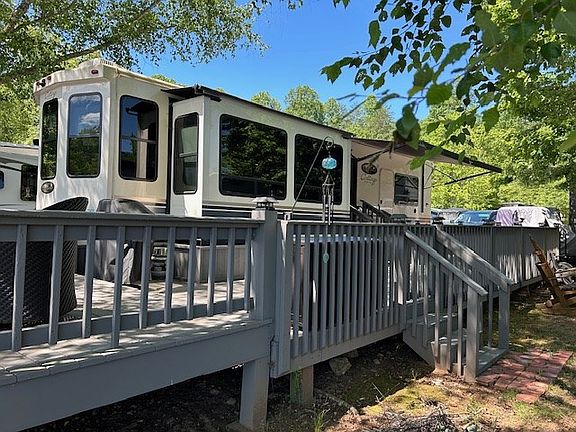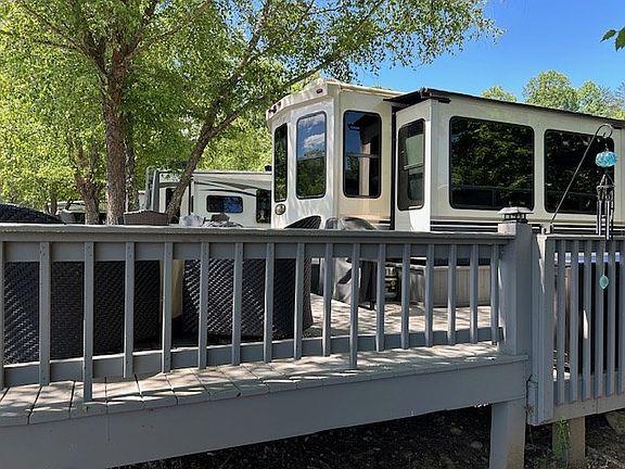 Newer RV with large deck and separate building for additional sleeping. Sold with all furnishings on the interior and exterior but does not include the golf cart. Two slide outs, king size bed, full kitchen with full refrigerator, gas stove, dishwasher, microwave and oven. Fireplace in the living room. Sofa makes a second bed. Two reclining chairs and TV in living area and in bedroom. Full shower in the bathroom. Home has hookups for washer and dryer. Island in the kitchen and ample storage. Exterior deck has two levels and overlooks the lake. Two tables on the deck, one dining high top table and one firepit table that is gas. Exterior grill on the lower deck. Shed has a king size bed and one upper bunk bed. Small refrigerator in the shed, New AC unit in the shed. Small chest and two chairs are also located in the shed. Concrete parking pad for 2 cars. Easy access to the party pavilion and community laundry and showers. Quite area.