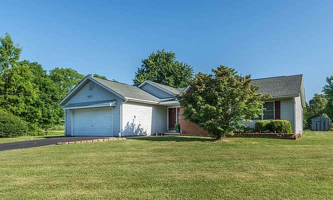 Sitting on a beautiful two-acre, tree-lined lot this 3-bedroom, 2-bath home built in 1989 offers 1700 square feet of living space. The ranch-style home with red-brick accents offers an easy-living floorplan to accommodate any lifestyle. It offers a large living room with wood floors that opens to the tiled kitchen and dining area that leads to a screened-in patio through sliding glass doors. The master bedroom and bath includes a tub/shower combination, two additional bedrooms and a full bath complete the home's living quarters. It also includes a laundry room/ mud room and oversized two-car garage with plenty of room for storage. Updates include a new roof, added insulation and new high efficiency furnace leading to low heating costs. Beautiful private yard with storage shed.