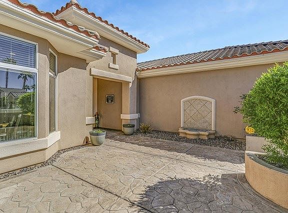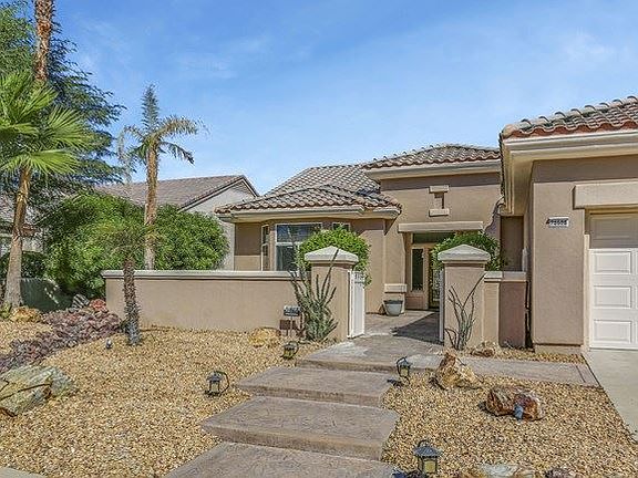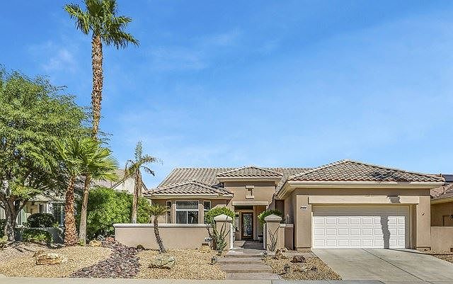 Exceptional Sonora Model with 2 bedrooms, built-in double office and 2 full bathrooms. Gated front courtyard leads to multi-lighted front door entry. Home has beautifully tiled floors and high ceilings. Awesome kitchen has been redone with designer counters, backsplash, hardware and Blanco sink. Pantry and cabinets have pull-outs for easy access. Newer Stainless steel appliance, center island, eat-in kitchen area with Bay window and breakfast bar. Living room has grand fireplace and built-ins. Dining room is open and expandable. The built-in lighted bar has wine fridge. Master suite is entered through double doors and has a large Bay window with window seat for extra storage. The bathroom has double sinks, jetted tub, seperate shower, and walk-in closet. There are 2 other good sized rooms, one with double office built-ins which can be used for an additional guest room. Laundry room has another pantry and cabinets. Lovely privacy yard features outdoor BBQ and Bar, fire feature, astroturf, covered patio with fans, built-in planter areas and multiple entertainment pads. Garage has extra storage also. Some furniture available outside of escrow. Sun City Palm Desert is a 55+ senior gated community.