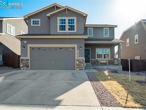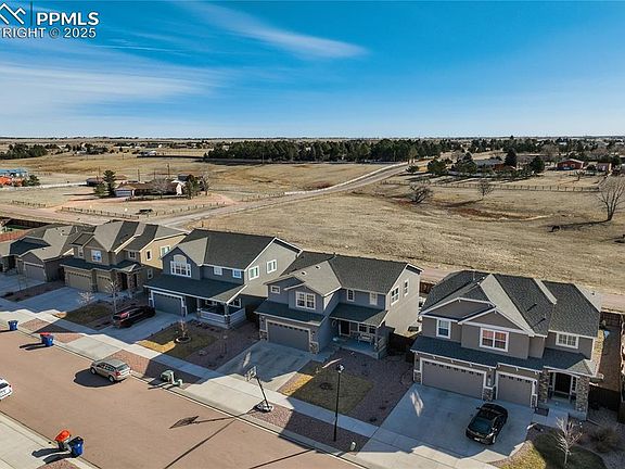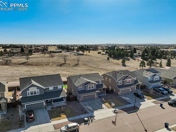 Stunning 5-Bedroom Home w/Scenic Views + Modern Comforts! Set against a backdrop of rolling hills and horse pastures, this elegant 5-bedroom, 3-bathroom home offers a rare combination of tranquility and convenience. The fully landscaped backyard features an expansive stamped concrete patio, garden beds, and direct access to a walking trail, creating a peaceful, rural feel—right in the heart of the city. Inside, an abundance of natural light fills the open floor plan. The main level boasts beautiful hardwood floors, a private office w/French doors + spacious Great Room equipped with surround sound for a true cinematic experience. The chef’s kitchen is a standout, featuring 42” cabinetry, slab granite countertops, a walk-in pantry with custom shelving covers, choice appliances + an island/breakfast bar. The dining area flows seamlessly to the backyard, perfect for entertaining. Upstairs, the luxurious Owner’s Suite offers stunning Pikes Peak views, vaulted ceilings, and a spa-like 5-piece ensuite with quartz countertops, dual sinks, a soaking tub, a walk-in shower + a large walk-in closet. Three additional bedrooms, a full bath, laundry room and an expansive loft/flex space with a decorative faux fireplace and bookshelves complete the upper level, offering versatility for a home office, recreation, or creative space. The partially finished basement includes a recreation room, the 5th bedroom + an unfinished area with rough-in plumbing for a future bathroom, giving you space to customize and expand or leave as storage. Additional upgrades include paid-in-full solar panels (2021) for immediate energy savings, a new hot water heater (2021), central A/C, a whole-house humidifier + a radon mitigation system. Located in District 49, this home offers easy access to Woodmen, Hwy-21, military installations, hospitals, VillaSport, Dublin Commons, First & Main Town Center (IMAX) and Vibrant Powers Corridor w/endless shopping, dining + entertainment options! *ASSUMABLE LOAN!*