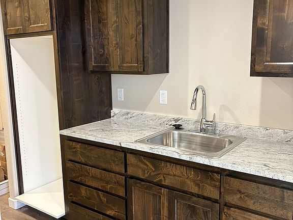 The kitchen features rich, dark wood cabinetry, sleek stone countertops, and a stainless-steel sink that complements the clean design. The open layout allows for efficient use of space, providing both function and style.