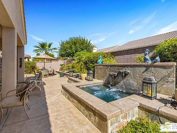 FABULOUS in both form + function! A STANDOUT on Rainswept Way at Sun City Palm Desert. 3 bedrooms, 3 bathrooms + den. 2,368 SF. Covered patios and pergolas work their MAGIC and a large, detached CASITA is a joy. Landscape design paired with exceptional hardscape is notable. Waterfalls play beautifully atop this spa built for six. Formal living, dining, and chef's kitchen make for great backdrop for entertaining. Natural light is a game changer in a home like this one. LOVING the clerestory windows. Island-centered kitchen w/ breakfast area + French doors opening to the patio. A built-in desk as well. Take the VIRTUAL TOUR for a better sense. The en suite primary is positioned behind double doors and features direct patio access. Spa-inspired bath with dual vanities, separate tub + shower, clerestory windows, large walk-in closet. Onto the den and home office positioned along a separate hallway. The office with handsome built-ins and two workstations could be enjoyed as a guest room. Utility room with sink and built-ins leads to a 2-car garage. Detached CASITA w/ private bath and refrigerator is yet another stop. Leased solar in place. Upgrades include new exterior solar shades for south-facing windows. There are hidden pull-down interior shades in the living room and a newly refurbished patio in the backyard. You'll find attention to detail is a theme. Sun City Palm Desert is a 55+ community recognized by Money Magazine as one of the ''8 best places to retire in America." Two 18-hole golf courses, racquet sports, 3 clubhouses, 2 fitness facilities, and 80+ social clubs. Enjoy it all!