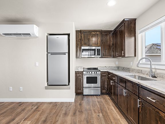 Brand new- never lived in home! Enjoy a stylish, open-concept studio featuring its own private entrance accessible via keypad or key. This modern living area includes top-notch amenities for your convenience. Highlights include sleek granite countertops, stainless steel appliances, upscale luxury vinyl flooring, and energy-saving design. Ample natural light streams in through large windows, while additional perks such as shared laundry facilities, communal storage, a scenic balcony, and a community stairwell are available. The property also boasts a cozy fenced patio for your enjoyment. 1 bedroom, 1 bath- upper level with good views.