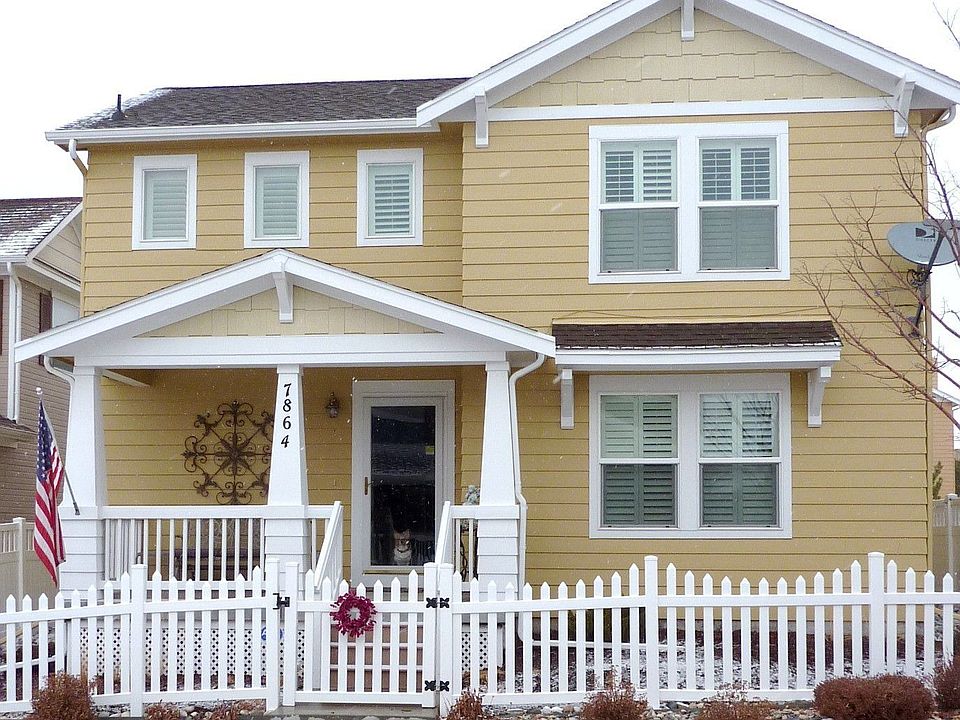 Adorable Victorian-esque neighborhood. Home faces courtyard, back is xeriscaped and perfect for entertaining. Standard 2-car is insulated and finished. Kitchen has hickory cabinets, island with sink, custom slide-out drawers in lower cabinets. Kitchen and dining room share hardwood floors. Berber carpet, upgraded wrought-iron railings, loft plus living room. Wood plantation shutters in every window. Peak views from front covered porch.