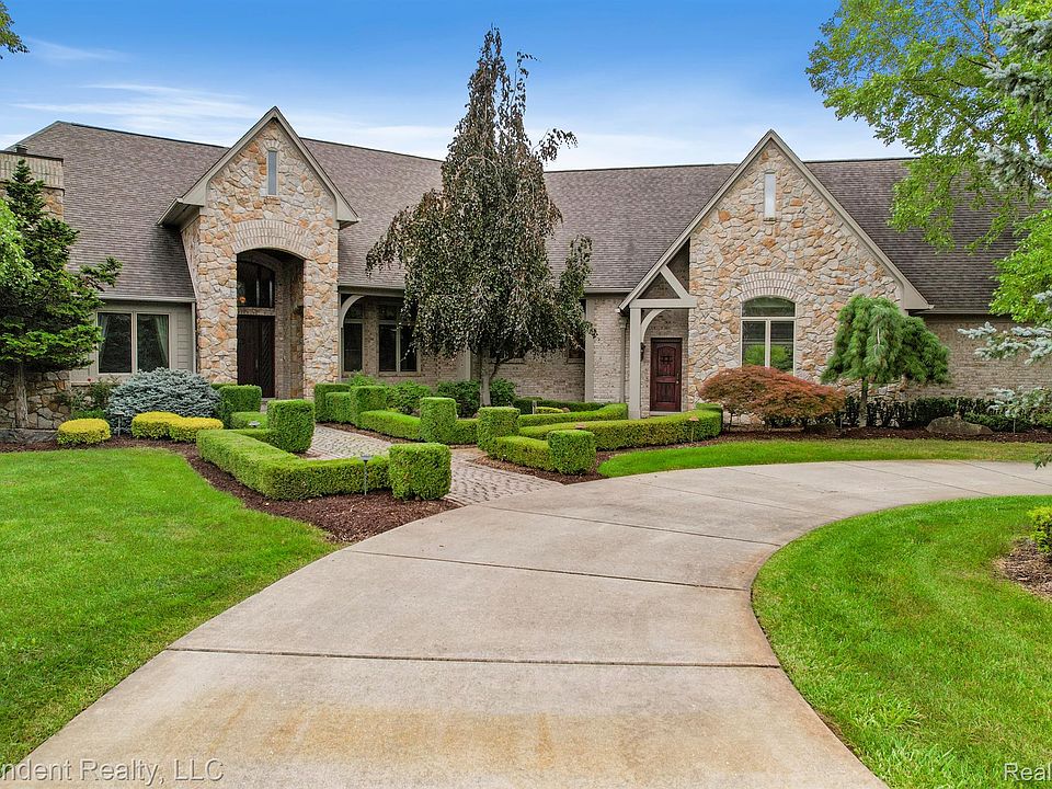 This magnificent country French estate is nestled upon 5.2 tranquil acres in the Harvest Meadow neighborhood of Bruce Township. This home features fine appointments and master craftsmanship starting from the custom front entry door to the travertine, slate and hardwood floors, to the assortment of volume ceilings in nearly all habitable rooms, high end and luxury finishes abound. Offering 4,900 square feet of finished living space on the main floor, and an additional 4,900 of finished space in the daylight lower level. The entry level offers a generous primary bedroom suite with fireplace, large walk-in closet and primary bath with heated travertine floors, jetted tub and large walk-in stall shower, two bedrooms and full baths on the south wing of the home, one-half bathroom, a great room with fireplace, gourmet kitchen with Woodmode cabinetry and Thermador cooking appliances, a kitchen hearth room with see thru fireplace to the great room, dining room, study, game room with wet bar, and a spacious laundry room. The daylight lower level includes a rec room, full bathroom with adjacent sauna, an impressive home theater, and vast craft and numerous storage rooms. The oversize heated 3 car garage offers built in cabinetry with work bench area, utility tub and stairway to lower level mechanical/water softener room. The exterior offers professional landscaping with an interesting assortment of trees and landscaping, brick paver pathways leading to all entry doors and to the elevated patio area and covered rear porch with slate flooring and built-in Viking natural gas BBQ making this outdoor space excellent for entertaining family and guests. Other notable features include, Pella windows, central vac, built-in audio system, jamb switches for closet lights, 8' tall solid wood interior doors w/ ball bearing hinges, rocky mountain door hardware and much more. Ask for full list of features. This property is a one of a kind gem and will provide a unique and upscale living experience.