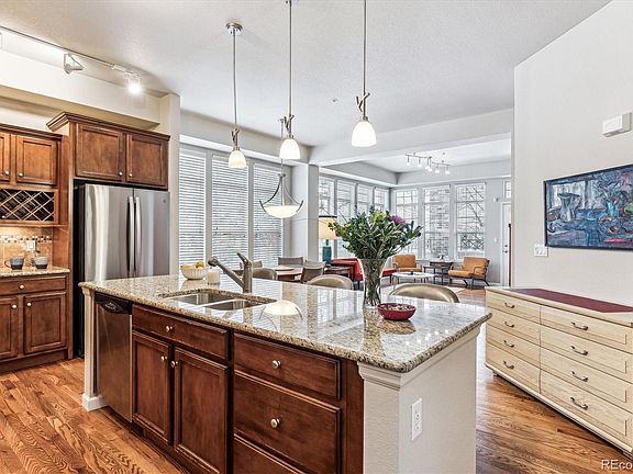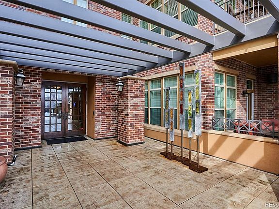 Beautiful End Unit situated next to a lush landscaped courtyard. Large eat-in kitchen is a chef's dream. New Refrigerator, granite countertops, pantry, Island with plenty of room for barstools and spacious dining room. Private office space with french doors. Primary bedroom with En-suite bath and large walk-in closet. Additional bedroom and full bath. Cozy living room with gas fireplace. One of the best features of this home is the expansive patio with gas firepit. This Open Concept home is perfect for entertaining. Tall ceilings and tons of natural light throughout. NEW FURNACE (February 2024) with transferable warranty, NEW CARPET (February 2024), NEW REFRIGERATOR (February 2024) and FRESHLY PAINTED (February 2024). T.V. and T.V. mount in the living room is included. Secure parking garage with 2 parking spaces and a secure storage unit. Cherry Creek School District, walking distance to shopping, restaurants, light rail and more. WELCOME HOME!