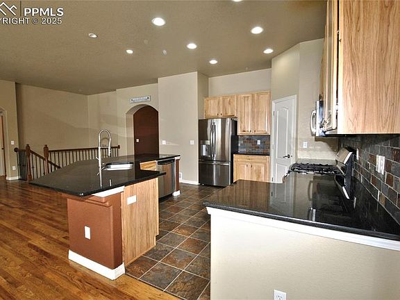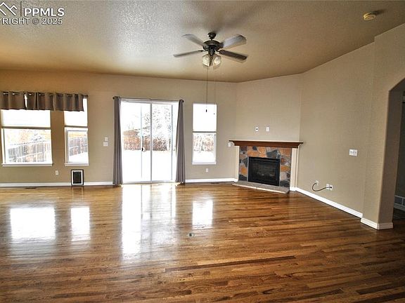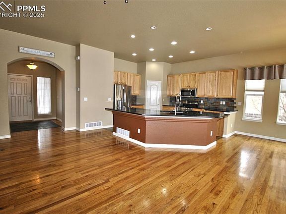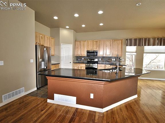 BIG AND AIRY!! Classic Rancher on quiet cul-de-sac with Mountain Views and Main level living. Beautiful hardwood floors grace most of the main level. Great room style living, dining and kitchen area accented by gas fireplace and granite counter kitchen complete with all the appliances. Front bedroom study plus huge master suite complete with 5 piece luxury bath. Full finished basement has huge family room and 3 big bedrooms. Decorator accents include steel railing to basement, 2 tone designer paint, Custom blinds, Stainless Steel appliances, Beautiful yard and So Much More. Close to Schools and Schriever Air Force and Falcon Air Force Bases!!