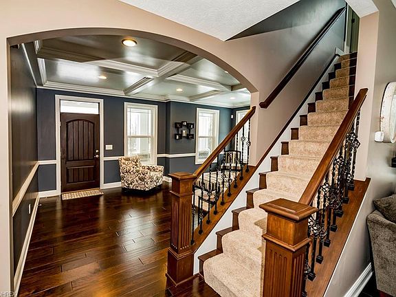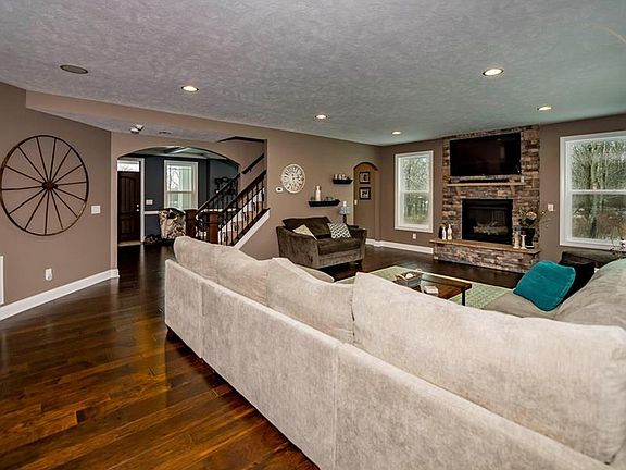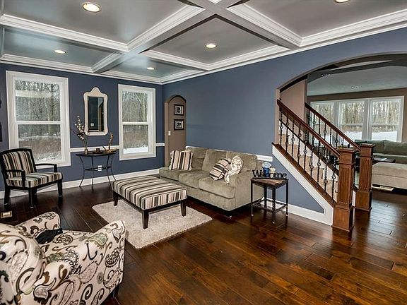 Exquisite detail throughout this 2014 built custom home with 9 foot ceilings. Inviting large covered front porch welcomes you to open Dining Room w/covert ceiling & tall windows leads to iron spindled staircase & second floor. Idea, wide open floor plan on 1st floor great for family gatherings & entertaining. Seamlessly blended kitchen w/gorgeous gray cabinets & Granite-Leather textured countertops, Enormous center island w/plenty of seating & cabinet space, tile backsplash is defiantly a focal point, Stainless Steel appliances includes wall double oven, convenient island microwave & gas stove. Don't forget the beautiful hardwood floors that flow throughout the 1st level. Off the Kitchen is an arrival area from the heated garage w/coat & bench area which then conveniently leads to 6x9 walk-in coat & shoe area. Private 1st flr office off hallway & includes half bath. Grand, Great Room w/stone hearth, flanked by windows & gas fireplace shares a focal point, plus more towering tall windows for added natural light & flawless décor continues throughout entire home. 2nd floor with 1930 Sq. ft. accommodates 4 Bedrms and 3 Full Baths & Ceramic Tiled Laundry Rm. Master bath w/double sinks, tile flrs, soaking tub, His & Hers walk-in closets and trayed ceiling. Great bonus room off Wide hallway could be used as 4th Bedrm. 3 car attached garage w/ additional basement entry+ 2 car detached garage w/attic access & covered porch. Patio off kitchen w/country views!