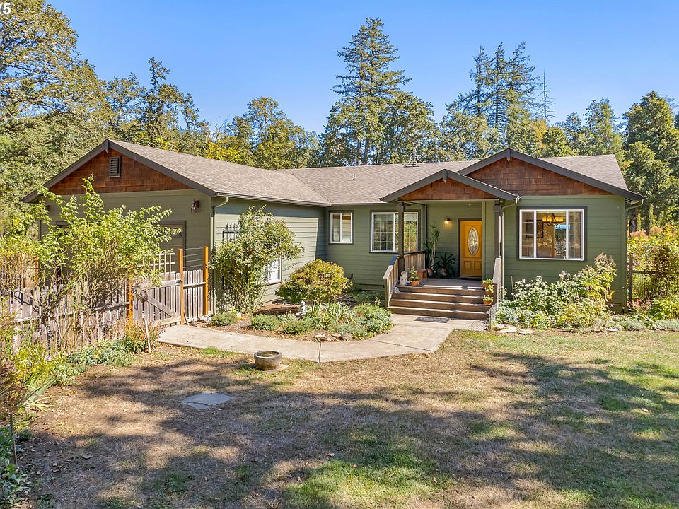 Discover Your Perfect Country Retreat on 5 Sunny, Flat Acres Just Minutes From the Heart of Cottage Grove! Whether you're dreaming of hobby farming, starting that vegetable garden you've always talked about, or simply want room to breathe, this special property delivers on all fronts. The impeccably maintained, 1-level home with front and back decks is set way back off the road and features beautiful bamboo floors, 9 ft ceilings plus a vaulted great room, newer appliances and a cozy pellet stove. The primary bedroom suite has a dual vanity and walk-in closet while the office with French doors could serve as a fourth bedroom. The outdoor space is what makes this property truly special! The fully usable, level land is a mix of oak groves, open pastures, a seasonal creek and established gardens w/ roses, hydrangeas, dahlias & plenty of spring bulbs that'll surprise you with year-round color. Fruit lovers will appreciate the pears, plums, tart cherries, blueberries, strawberries and raspberries. And the raised beds (built from trees milled on this property!) in the deer-fenced veggie garden have a drip system and are ready to plant your fall crop. There are 3 outbuildings including a studio w/ an attached carport, a new 20 x 20 shop perfect for projects and storage and a loafing shed that's practically begging to become a chicken coop or goat house. Also features new furnace & heat pump, new electrical panel, new exterior paint, fencing and cross-fencing (perfect for animals!), 2 wells (house well w/ new UV system and irrigation well) and gas generator. The peaceful and private setting offers the perfect blend of rural tranquility and close-in convenience.