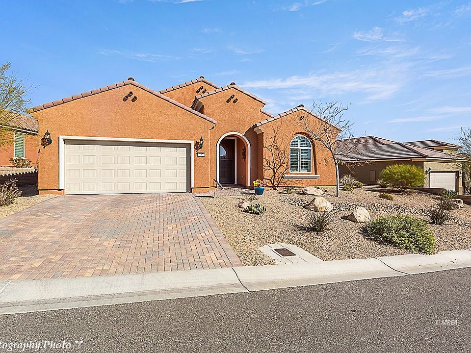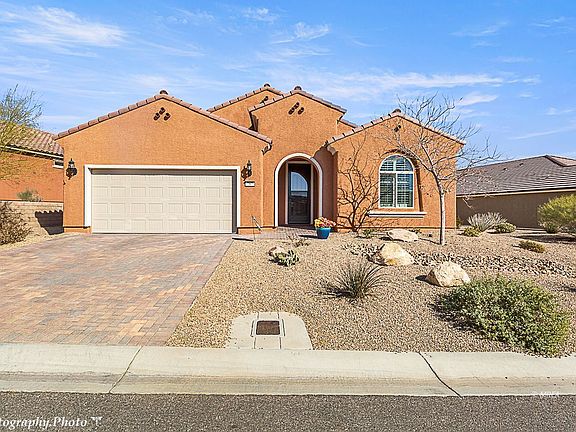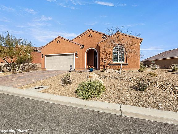 Picturesque Elevation... With 1864 SF, 2 bedrooms plus a den/office, this Sun City Haven model is located on an premium elevated home site that offers stunning surroundings and gorgeous views of the mountains. The Spanish entry is tasteful as the decorative brick pavers line the drive & entry. A large covered patio maximizes outdoor living space. Extended paver patio provides plenty of room for outdoor furniture & the mountain views are incredible. Dramatic 9-foot ceilings welcome you in the home. A central courtyard, large picture windows and a costly oversized slider allow for abundant natural light throughout. Custom wood looking tile, warm paint tones and costly plantation shutters are appreciated. The kitchen is centrally located and boasts gorgeous granite, quality cabinetry, upgraded appliances (including a new refrigerator ) & induction cooktop. The master is spacious and the ensuite, luxurious... including upgraded countertops and custom tile surround walk-in shower. The closets have been recently customized with "Classy Closets". The garage has a separate storage room, plenty of cabinets and overhead storage. A brand new water softener, washer & dryer are included.