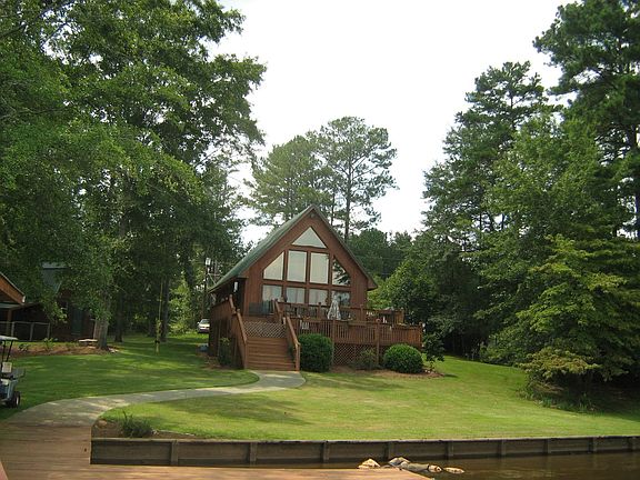 CUTE AS IT CAN BE!!! BEAUTIFUL LARGE WATER FRONT LOT W/BEAUTIFUL LANDSCAPING, BOAT HOUSE W/STORAGE AND WALKWAY FOR EASY ACCESS TO BOAT. FLOATING DOCK, PIER, SEA WALL, SPRINKLER SYSTEM, 4 WHEELER AND BASS BOAT. NEAT WATER FRONT CEDAR A-FRAME HOME W/LARGE FLOOR TO CEILING WINDOWS FOR LOTS OF LIGHT. THIS WONDERFUL HOME HAS OPEN FLOOR PLAN, HARDWOOD FLOORS IN LIVING AREA, GAS LOG FIRE PLACE, LOFT WHICH IS CURRENTLY USED AS BEDROOM OR COULD BE GAME ROOM OR FAMILY ROOM. THE METAL ROOF ONLY ADDS CHARM TO THIS CUTE HOME. A WONDERFUL TIERED DECK IS GREAT FOR ENTERTAINING OR SIMPLY RELAXING. NICE PORCH OFF BACK WITH RAIL AND GATE. 2 STORY CEDAR SIDING ACTION BUILDING,GREAT STORAGE! ONLY $299,900 CALL NOW Frances 706-681-4763