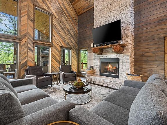 The main bedroom is a sanctuary with ensuite featuring an extra-large walk-in shower with a rain showerhead and a soothing waterfall. To complete the relaxation experience, a soaker tub awaits, inviting you to unwind. Second King room down also features a glamorous bath with triple water features in the shower. Private deck doors lead right to the hot tub. Two King rooms with ensuite baths upstairs are thoughtfully decorated and give a feeling of being right at home. All will enjoy the large gameroom with private balcony. The bunk room features sleeping area for 10 with attached bath and triple sink vanity. The entire cabin sleeps 18 in beds!