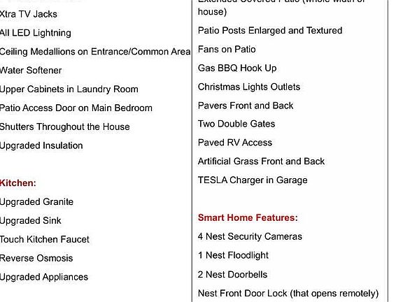 Stunning home with exceptional curb appeal in Sierra Montana! This semi-smart home is loaded with upgrades (huge list attached). All the appliances are included! Washer and dryer include Sidekick washer pedestal and dryer pedestal. Enjoy low maintenance living artificial turf in both the front and backyards, plus an extended covered patio that spans the width of the home. The three-car garage includes a Tesla charger and additional extra exterior parking with paved RV access, perfect for extra vehicles or recreational toys. Inside you will find stylish LED lightning, high quality shutters throughout, and a beautiful kitchen featuring premium cabinetry and a Touchless-activated faucet. This home truly has it all, you'll fall in love the moment to walk in!