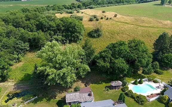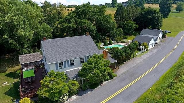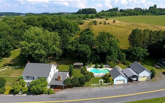 AS SEEN ON HGTV HOUSE HUNTERS 1850 Stone Farmhouse situated on 10+ acres. Zoned for horses, barn has water & electric. Beautiful hardwood floors & fully renovated kitchen with sub-zero refrigerator-freezer, stainless-steel Jenn-Aire down draft range/oven & dishwasher, granite counter tops & lots of cabinets. Kitchen bar stools remain. 4 bedrooms including a walk-out suite. Very large family room features a wood burning stove & attached sun room. Huge finished 3rd floor with built in cabinets could be an additional bedroom. Outside features a sparkling concrete pool & two garages connected by a car port providing parking for 4 vehicles. A beautiful log cabin with electric sits directly behind the house & is accented by a flowing natural spring that runs year round. A cleared path provides access to the entire property & majestic views. Large deck with hot tub spans the side of the house. Includes an American Steel Span 25'x35' Building Kit (unassembled). Newer tilt-out vinyl windows.