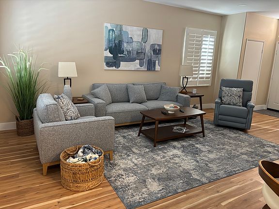 Month-to-month fully furnished short term rental located in the beautiful community of Del Webb/Sun City. Kitchen is fully loaded with plenty of dish ware, towels, and appliances. Large Master bedroom and bathroom with a walk-in closet. Laundry room is located inside home. Private backyard with patio covering and high walls. New laminated flooring, carpet in master bedroom, new bed and living room furniture. Two TV's one in living room and the other in master bedroom. The 2nd room has a Queen bed. Very clean and comfortable for short term rental. Garage will accommodate one car parking. Del Webb is very active and safe community. Beautiful surroundings, walking trails, clubhouses, library, pools, tennis/pickle ball courts, and of course golf courses. NOTE: Must be 55 or older. This is a requirement of the CC&R. This is an unfurnished home. This is a month-to-month short term rental in a senior golf course community.