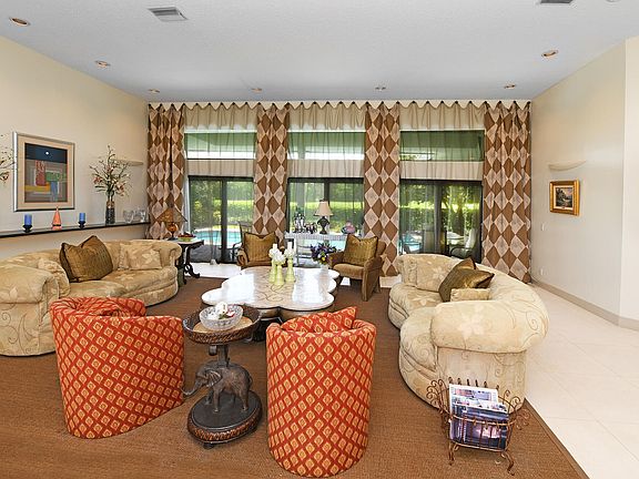 Spectacular one story golf course residence situated on the 7th fairway in Boca Grove. The house features four bedrooms, each with their own bath, and a den/bonus room with bath ensuite. The open floor plan is great for entertaining and the split bedroom layout allows privacy for all family members. The spacious master suite boasts his/her closets and a lavish master bath with a stand alone European tub. The gourmet kitchen, with newer appliances and granite counter tops, leads to a lovely family room with views of the pool and golf course. Hurricane protection in the form of impact glass completes the package. Come and experience all that Boca Grove has to offer.