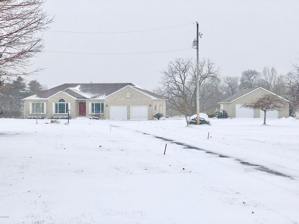 This is a very nice brick ranch style home on 10.1 acres in Middleville. First time ever offered. The quality of construction shows in this 4 bedroom and 4 baths home with a finished walkout basement. The 2 fireplaces create a calm ambiance while the view out the many windows are just as relaxing. 2-stall attached garage plus a 40x28 pole barn! You will love the large rooms, high ceilings and Anderson windows in this home. Kitchen offers solid surface countertops, appliances included, built-in desk work station, and tile flooring. Main floor master suite with soaking tub and a gas fireplace in the living room. Lower level features bedrooms 3 and 4, a full bath, laundry room/kitchen area. This home was very creatively and functionally designed. It is a fantastic home in a great area.