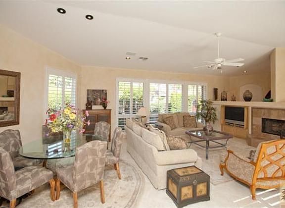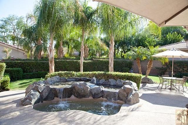 POSITIVELY CHARMING! Enviable 10,000+ sq. ft. corner lot with privacy, all-day southwest sun, flowers, palm trees; tranquil water feature with enlarged spa and cascading waterfall; and, sparkling-clean built-in barbecue! Meticulously maintained by its original owners, this Malaga plan with fireplace is lightly fauxed with custom shutters throughout. Beautiful amber-toned granite counters complement golden-hued cabinets and upgraded ceramic tile flooring. Thoughtful kitchen additions include pull-out drawers and built-in desk and wall unit. The third bedroom/den enjoys large-scale custom cabinetry for the ever important home office. One powder bath doorway became a wall to enhance the space. Oversized two car garage plus golf cart garage, including golf cart and two bicycles! Furnished per inventory list. You've got to love this pristine cottage in the heart of revered Rancho La Quinta Country Club.Brokered And Advertised By: Rancho La Quinta PropertiesListing Agent: Christine Stamnes