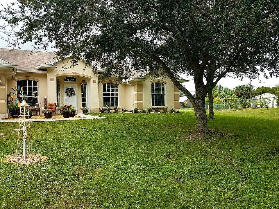 2003 CBS home on an oversized (.39 acre) with lots of privacy and NO HOA. Totally renovated with new paint, brand new whirlpool stainless steel appliances, new carpet in bedrooms, ceiling fans, light fixtures, faucets, hardware, etc. Features vaulted ceilings (tray in master), fireplace, and tile in all living areas. Screened 128 sf lanai. Backs up to canal/retention ditch. Empty wooded lots behind, next to on one side, and across the street. Brand new HVAC system, brand new water heater. Well water with treatment system in the garage. Built in shelves in garage. Aluminum panel hurricane shutters on all windows, and accordian shutters across front porch and across 10' slider window on lanai. Rightwood privacy fence across the back side of the property.