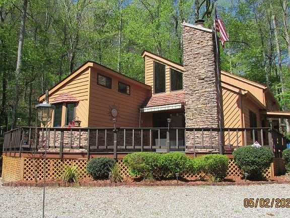 Very extraordinary home only 2 minutes from Young Harris College. Unique design with huge Great Room, fireplace, wood & sheetrock combo, open kitchen and dining area. Numerous windows and skylights to allow natural sunlight to brighten the home. Gorgeous, spacious Master suite on Upper Level. Lots of nature's beauty outside, lush green lawn, blooming wild rhododendron, babbling brook just off kitchen porch and forested woodland lend to a very private sanctuary. Home includes a covered garage with door and two open carports - one will accommodate an RV with hook-up. Great, beautiful home for the money.