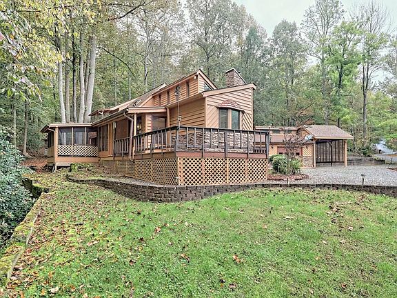 Very extraordinary home only 2 minutes from Young Harris College. Unique design with huge Great Room, fireplace, wood & sheetrock combo, open kitchen and dining area. Numerous windows and skylights to allow natural sunlight to brighten the home. Gorgeous, spacious Master suite on Upper Level. Lots of nature's beauty outside, lush green lawn, blooming wild rhododendron, babbling brook just off kitchen porch and forested woodland lend to a very private sanctuary. Home includes a covered garage with door and two open carports - one will accommodate an RV with hook-up. Great, beautiful home for the money.