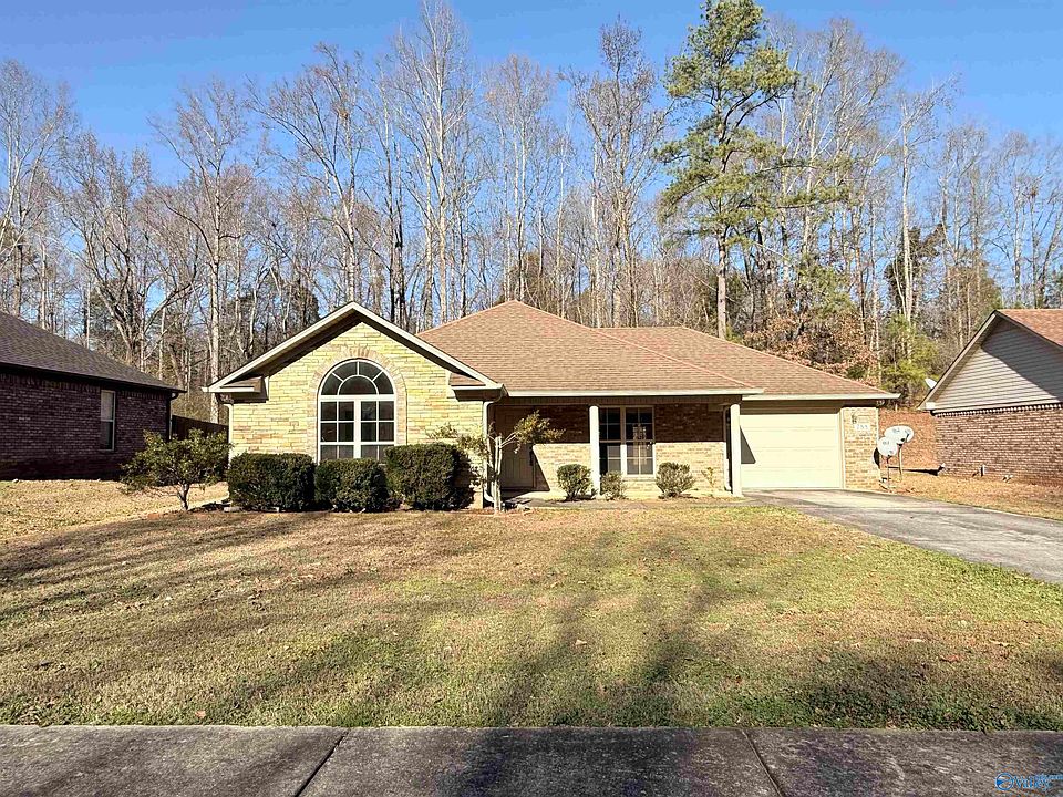 This charming 3 bed, 2 bath, full brick home on a large 0.63-acre flat lot offers privacy with mature trees, a private, covered back patio. Great floor plan with loads of features: A covered front porch, cozy family room w/ fireplace, trey ceilings, built-in bookshelves, & crown molding. Featuring a large, modern kitchen w/ pantry, lots of storage, & separate laundry. The isolated master bedroom features a vaulted ceiling with fan, walk-in closet, and on-suite bathroom. One car garage and extra storage space. 10 minutes from shopping & schools and 30 min to Huntsville & Redstone Arsenal. Very low maintenance all brick, beautiful-stacked stone, vinyl windows, eaves and gutters. NO HOA!