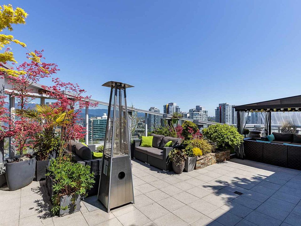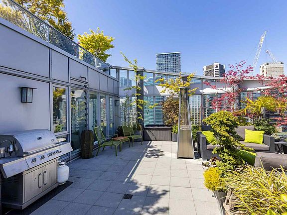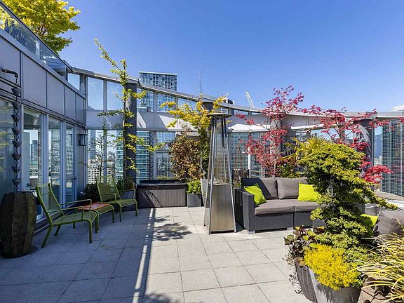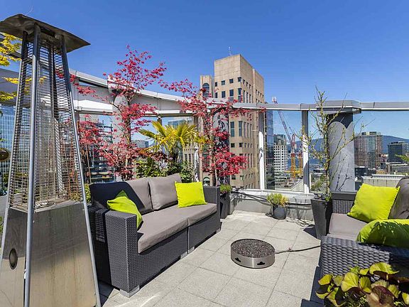 Hamilton Hideaway. A 3-bed sub-penthouse, in the heart of DT with its own yard in the sky: the most private, sunny, usable patio in the building, complete with fully-irrigated landscaping, fountains, a pond, covered & uncovered seating & wind shield. Protected views of Burrard Inlet & North Shore Mountains. Interior offers ample space for living & home office, master suite opposite other bedrooms, new flooring, updated bathrooms & windows in 3 directions. Open-concept living area centered by modern FP wall. Modern kitchen fts. an abundance of cabinetry, wine fridge, Fisher & Paykel s/s double-door fridge & double-drawer DW. 1 parking (more spots for sale) & huge in-suite storage. The perfect urban place to work from home & enjoy the outdoor without ever needing to leave.