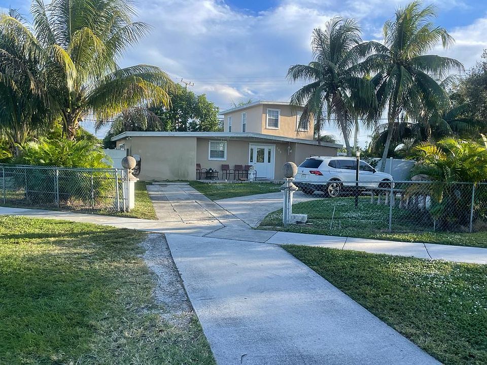 Beautiful SF 4/2 home with large yard space to expand and for pool, 3 bed rm and 1 full bath on ground floor, 1 master bed rm and 1 full bath on 2nd floor, no HOA, large back fenced yard with palm trees and screened patio, corner lot with shed and BBQ corner, new roof Aug. 2022, new A/C, new wtr htr, new fence, hurricane shutters, front yard fenced with circular driveway 2 entrances, front porch, lots of cars space, very privately and conveniently located!