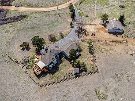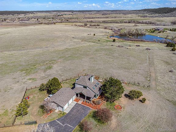 A hidden gem nestled below Castlewood Canyon on a beautiful cul-de-sac with canyon and plains views! This 12-acre horse-ready property has approximately 10 fenced acres and a 5-stall barn with post and dowel fencing. The house features a gourmet kitchen with granite countertops and 42" maple cabinets, a pantry with slide-out shelves, and a large butler pantry for added storage and workspace. Vaulted ceilings with skylights and an efficient wood stove in the living room make for a very cozy environment. The master bedroom and bath are located on the first floor with access to the large remodeled deck directly from the bedroom. The master bath has radiant flooring, a frameless shower, and an indoor hot tub room that walks out to a small screened-in porch. Two bedrooms and a full bathroom are upstairs along with a loft space which is perfect for a reading nook or office space. The finished basement provides a great space for entertaining, working out, or watching a good movie! There is ample space for storage and the laundry occupies a large room with space for hanging and folding clothes. The deck runs 3/4 around the house with a newly remodeled pillared front porch. Access to 40 acres of community open space, which includes a beautiful pond, allows for a great place to ride horses, take a walk, fish for bass and bluegill, and commune with nature! The back deck lends a great place to entertain or just enjoy the evening gazing at the stars. An LG Minisplit heat pump provides heating in the winter and cooling in the summer, assisted by a whole-house fan and baseboard electric heaters. A generator-backed fire suppression system was installed to mitigate the threat of wildfires. This home has been loved by the current owners for nearly 30 years and features unthinkable details to make country living the best! Come visit this little piece of Heaven and fall in love!