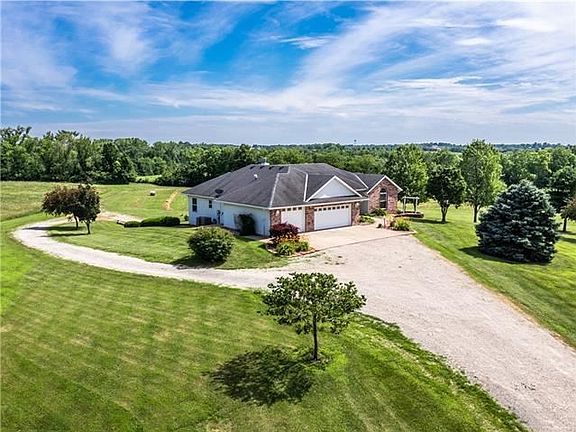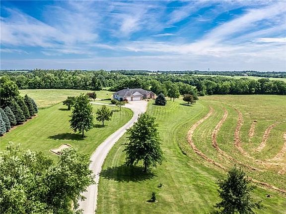 Just off 169 and North of KC this beautiful location is perfect!! This is a one owner, custom made home, and tornado resistant ICF walls. This beautiful sprawling ranch with a walk out basement has everything you need, huge kitchen boasting a see-through fireplace from the living room, 20 acres with a pond and so much more. This could be your forever home!!!!