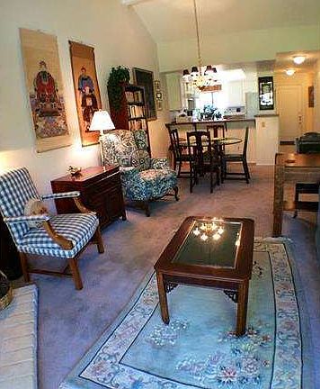 FHA/VA Approved -Upstairs Millstream with the best view ever. Cathedral ceilings complete with skylights. Real wood burning fireplace now with gas logs, eating bar plus eating area. Open kitchen has view to the living room. This phase has a real bath and 3/4 so the guest quarters has its own bath. Inside the unit laundry and air conditioning, too. One car enclosed garage. Master has cathedral ceiling and a walk-in closet. Both the master and the living room has sliders to the balcony and overlooks streams and green belts, and that is what this unit is all about. If you want an oasis, a retreat, a respite or a place to listen to the water and watch the streams, this is for you. Gated community with pool, spa, tennis. (Items excluded: Antique Brass Chandelier) New paint - Property in good condition - Sold As Is - FHA/VA Approved