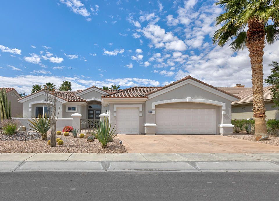 Unique opportunity to own a ''rebuilt'' Monaco floorplan home in the award winning Sun City Palm Desert 55+ active adult community.Everything in the interior of the home is new, including the roof and windows.NEW:Walls,high end plank tile floors throughout,ceilings,electric,plumbing,HVAC,water heater,central vac,quartz countertops,white cabinetry,crown molding,extra wide baseboards,pantry, inside laundry room with sink and built in desks,epoxy floor in the 4ft. extended two car garage and a separate golf cart garage.3 bedrooms and 3 ensuite bathrooms.This home was brought down to the studs and rebuilt due to a fire.78830 Sunrise Mountain View sits on the 17th hole of the San Gorgonio golf course,one of the two Billy Casper designed championship golf courses in Sun City Palm Desert, with breathtaking water views and views of the San Jacinto and Santa Rosa Mountains.You will not be disappointed!