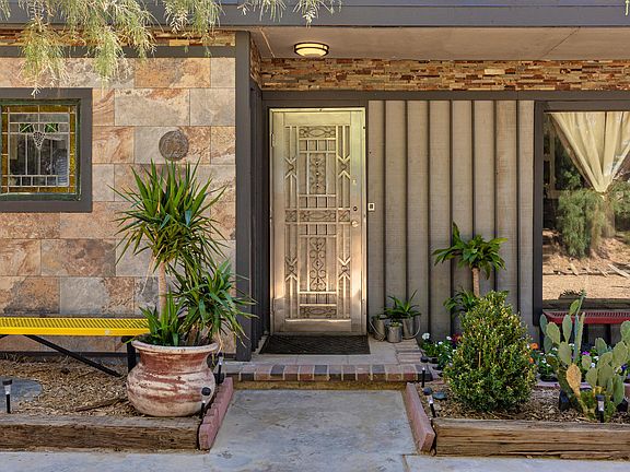 Nestled in California's desert, this 1956 mid-century modern home blends vintage charm with modern comfort. Surrounded by mature Tamarisk trees and desert flora, it exudes tranquility. The unique construction features stained-glass windows, a vintage 1910 stained-glass door, four bedrooms, 1.5 bathrooms, and a spacious master suite. A large fountain graces the property, and there's a generous utility room and a 400 sqft garage. The area is an outdoor enthusiast's paradise, perfect for motorcycles, ATVs, and exploration. Iconic landscapes from famous films are nearby, offering adventure and privacy. With 2.5 acres, you can cultivate a garden or raise animals. Inside, a central fireplace, six ceiling fans, updated lighting and wiring, and three new heating and cooling units offer year-round comfort. Modern kitchen appliances and upgraded glazing enhance the appeal. Half the roof is recently resurfaced. Proximity to well-maintained roads and utilities from Rancho Seco Corporation and Southern California Edison ensure convenience. This location is also prime for solar power generation. Embrace vintage allure and contemporary comfort in this desert oasis, perfect for a private retreat or adventure-filled escape. Make this unique home yours today.