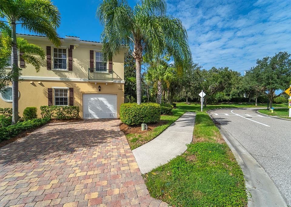 This Catalina townhome located in the Resort style community of Villagewalk has 3 bedrooms, 2.5 baths and a 1 car garage. The home has built in shelving, newer lighting, crown molding and a fantastic view of your private pool with lanai. Community amenities include a clubhouse with state of the art fitness center, card rooms, library and event space. e There is an on-site restaurant and bar. There are 6 har tru tennis courts, pickleball courts, bocce ball, and 2 heated pools, resort style and lap pool. VillageWalk has over five hundred acres of manicured grounds, great for walking and biking and is conveniently located to Siesta Key beach, Legacy Bike Trail, shopping, dining and more.
