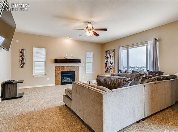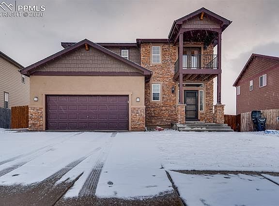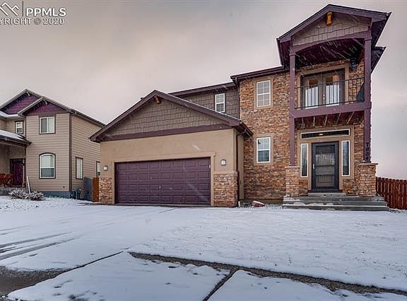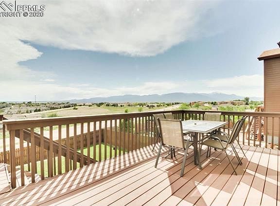 Perched high, this stunning 2 story home in Mesa Ridge is close to amenities, shopping, and quick access to I-25 and Highway 21 (South Powers Blvd); 10 min to Fort Carson, 15 min to Peterson AFB, & 20 min to Schriever AFB. The entrance greets guests with an impressive two story foyer, beautiful wrought iron stair case, and hardwood floors cascading with natural light. The hardwood continues through to the dining room and large kitchen boasting dark cabinets, stone countertops, stainless steel appliances, huge walk in pantry, and breakfast bar. This open concept house complete with air conditioning, connects the great room; with cozy fireplace and wired for surround sound, to all the other main living spaces, that are flooded with natural light from a wall of windows that steps onto a large composite deck with sweeping views of Pikes Peak, the Front Range, and city lights. The upper floor flaunts 4 large bedrooms, 3 bathrooms, walk in laundry, and a loft that opens onto a quaint Juliet Balcony; perfect for morning coffee, office, or bonus space. Enjoy your private two sided gas fireplace from either the master bedroom or accompanying on-suite jacuzzi tub. The large walkout basement features a 5th bedroom/bathroom, and is the perfect entertaining space, vaunting a wet bar with mini-fridge, a slider stepping into a sizable/fenced back yard complete with hot tub, beautiful grass, sprinkling system, and rocked area perfect for a play space, trampoline, or large shed. The attached two car garage includes a bonus space with work table and a wall of three-tier, built-in shelving/storage. Take advantage of the miles of trails right outside your door. You do not want to miss the Colorado beauty.